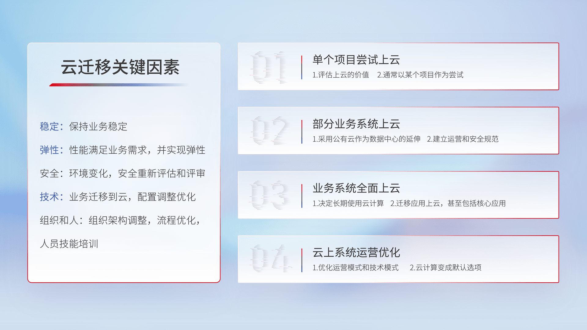 结合实际业务,,从规划设计、、、、云平台选型、、、云原生改造、、数据迁移、、集成交付,,,,迁移全过程为客户识别最佳上云路径,,做好风险识别管理,,,设计网络架构、、、、身份权限、、、安全审计合规、、、操作审计、、、、日志审计、、监控告警策略、、、、多站点容灾设计等,,对云上基础设施进行整体规划,,,,提升IT治理水平,,以满足弹性、、、高可用、、、高性能的需求。。。。